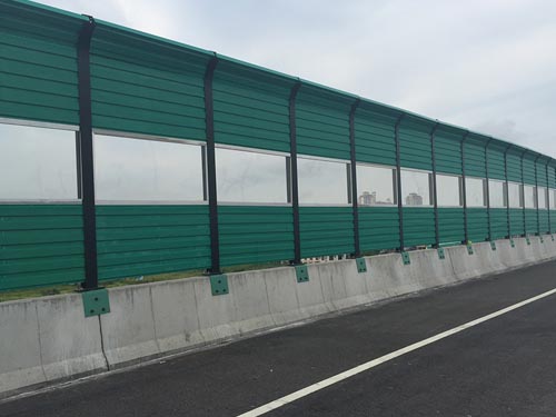 凹凸穿孔声屏障的减噪量与噪声的频率、屏障的高度以及声源与接收点之间的距离等因素有关。金属声屏障的减噪效果与噪声的频率成分关系很大,对大于2000Hz的高频声比800一1000Hz左右的中频声的减噪效果要好,但对于25Hz左右的低频声.则由于声波波长而很容易从屏障上方绕射过去,所以效果就差。通常,金属声屏障对高频声可降低l0—15dB。凹凸穿孔声屏障的高度,可根据声源与接收点之间的距离设计,金属屏障的高度增加一倍,则其减噪量可增加6dB,为了使金属屏障的减噪效果好,应尽量使金属屏障靠近声源或接收点。
